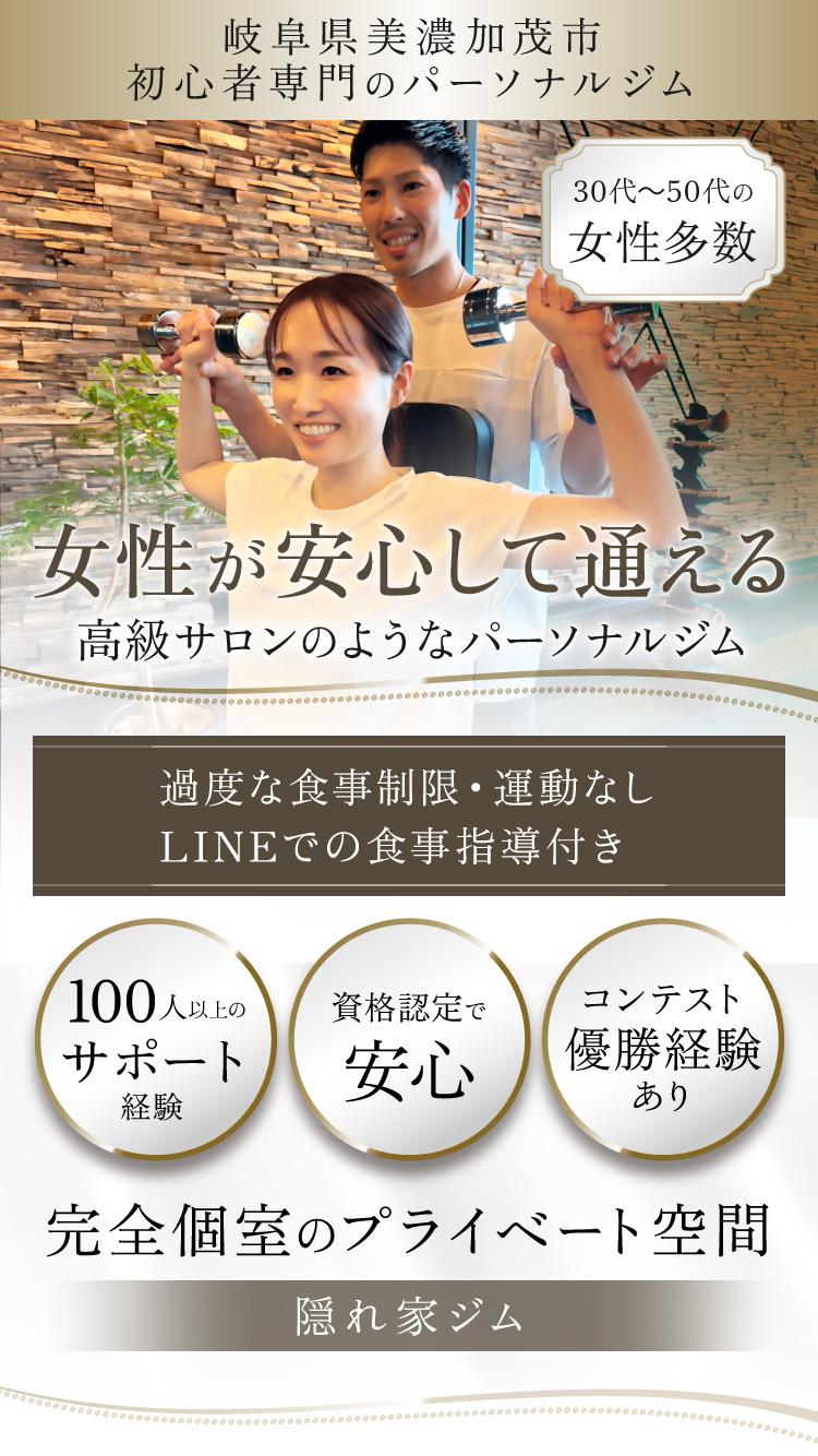 今までダイエットに失敗してばかり今度こそ痩せたい。「一人ではトレーニングが継続できないから伴走してほしい」という女性の方へ。高級サロンのようなパーソナルジムでの体験を一度お試しください。過度な食事制限や運動は一切ないのに理想の未来を実現できる。大会優勝経験があり資格認定保有者のトレーナーによる生涯役立つ身体作り。