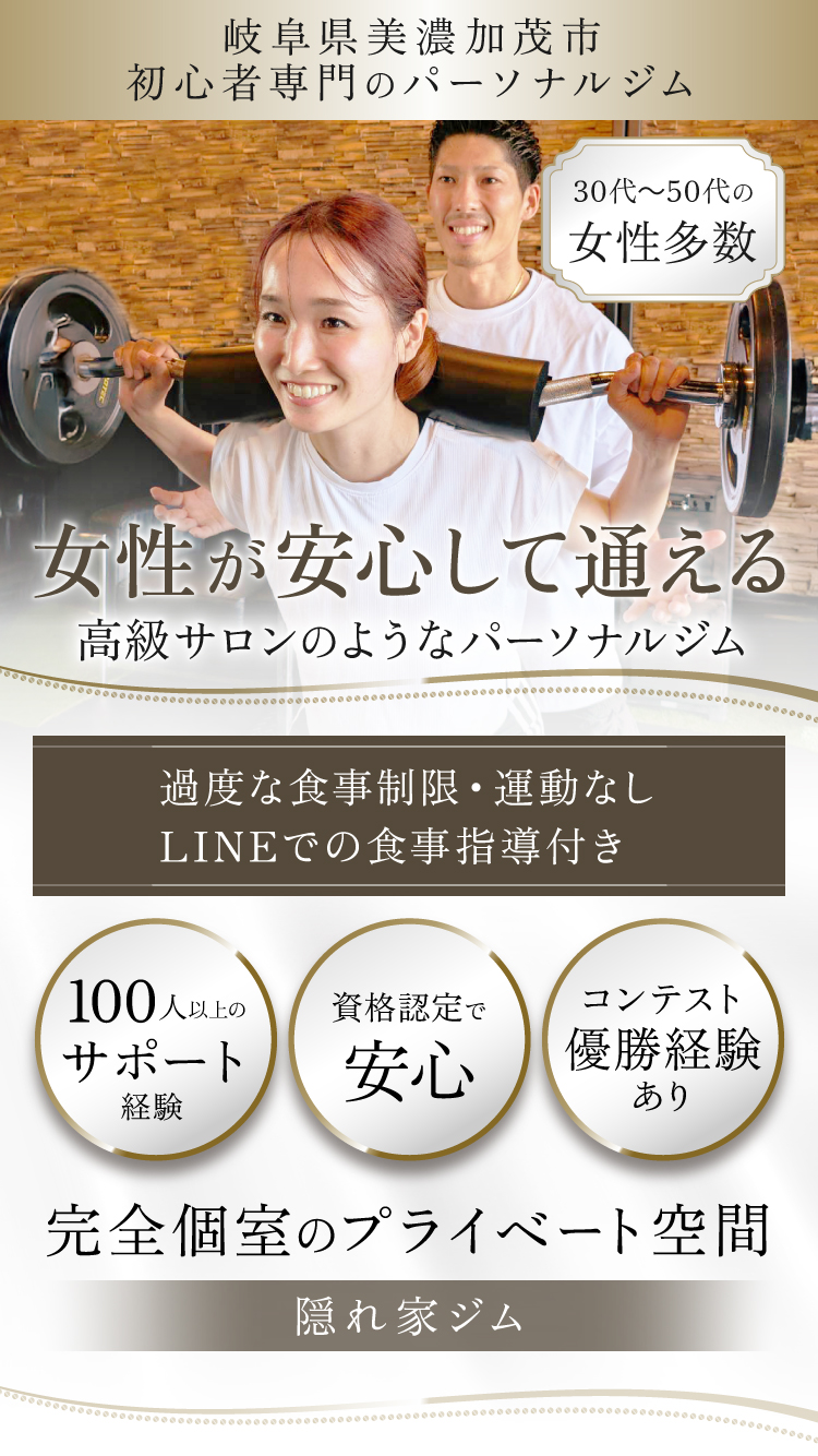 今までダイエットに失敗してばかり…今度こそ痩せたい。「一人ではトレーニングが継続できないから伴走してほしい」という女性の方へ。高級サロンのようなパーソナルジムでの体験を一度お試しください。過度な食事制限や運動は一切ないのに理想の未来を実現できる。大会優勝経験があり資格認定保有者のトレーナーによる生涯役立つ身体作り。